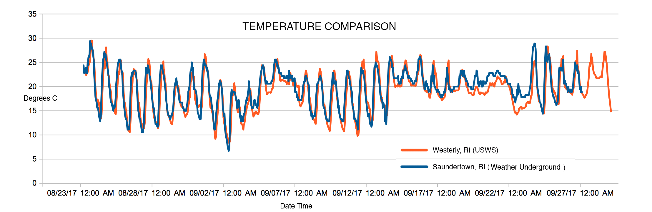 Students worked in groups to each create a graph that compared an air temperature data set found for Westerly, RI (USWS) with an air temperature data set found for Saundertown, RI (Weather Underground):