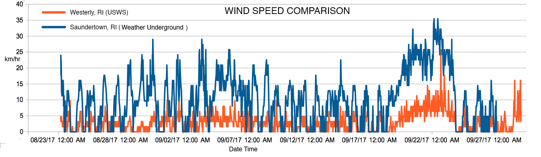 Students worked in groups to each create a graph that compared an air wind data set found for Westerly, RI (USGS) with a wind data set found for North Kingstown, RI (NOAA):
