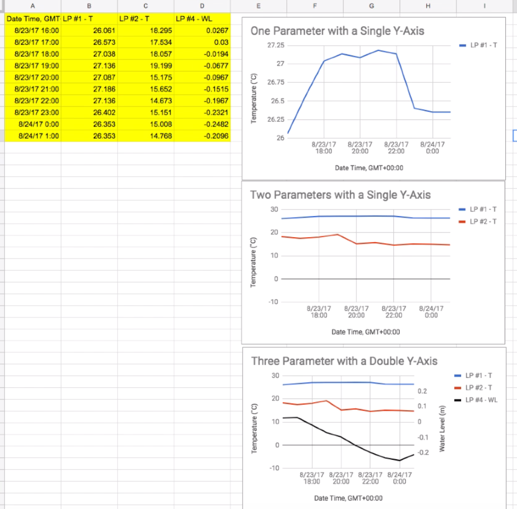 Students first created charts with a single parameter across time, two parameters across time, and three parameters across time with two vertical axes.