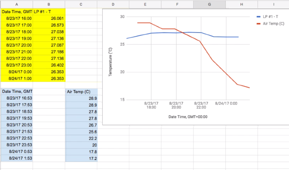 Jake looked at the sinusoidal effect of sunrise and sunset in the change in surface temperature. Rob showed the data for air v. surface water for a day as a double-Y axis plot.