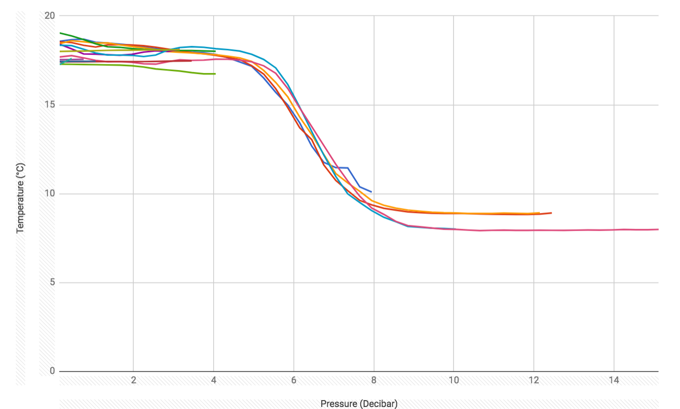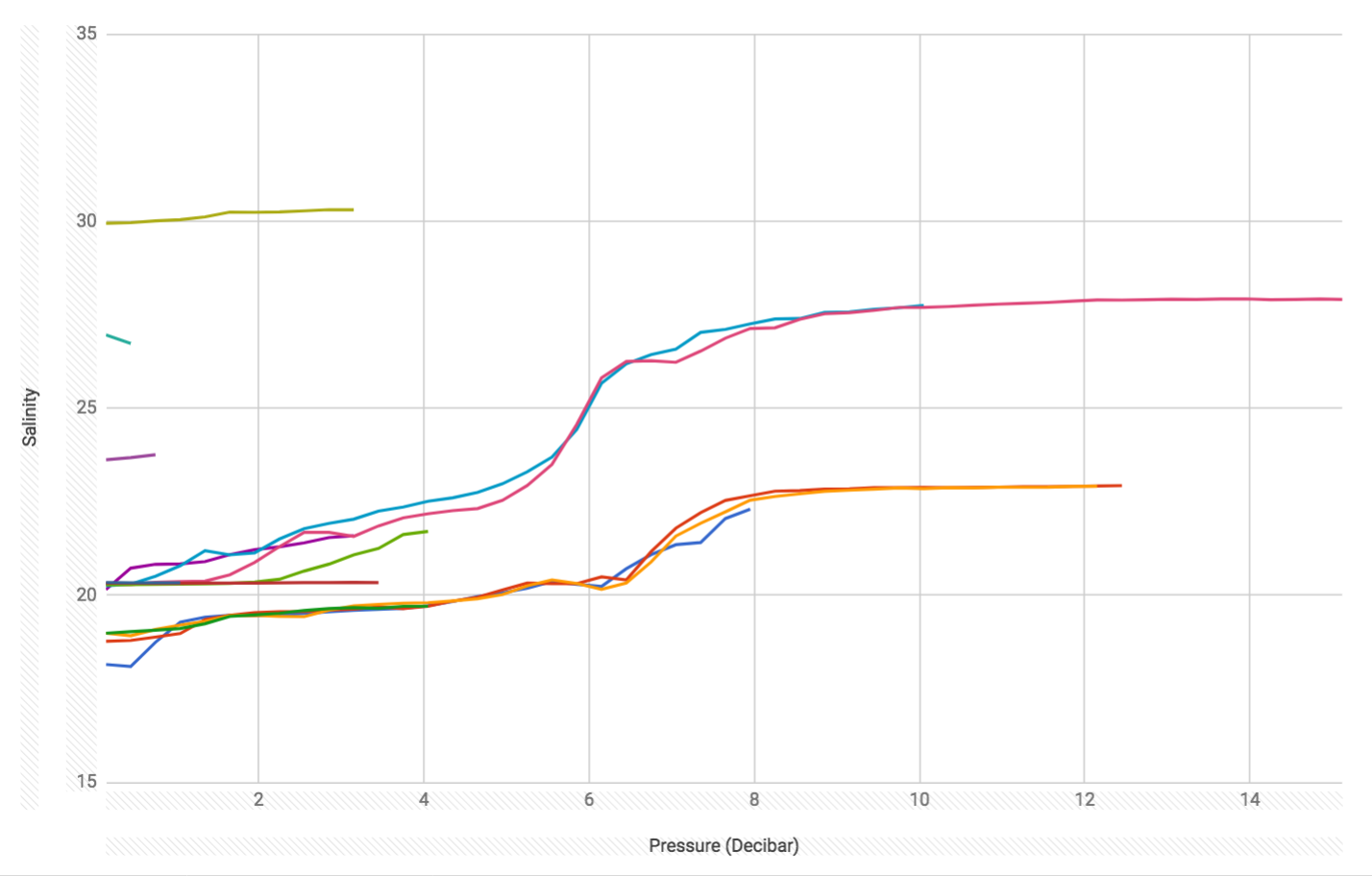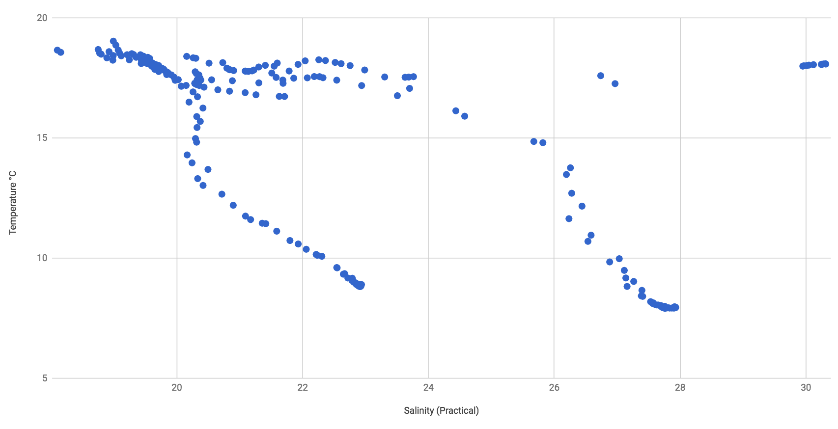 Bruce created a scatterplot of the salinity versus temperature for all depths per location