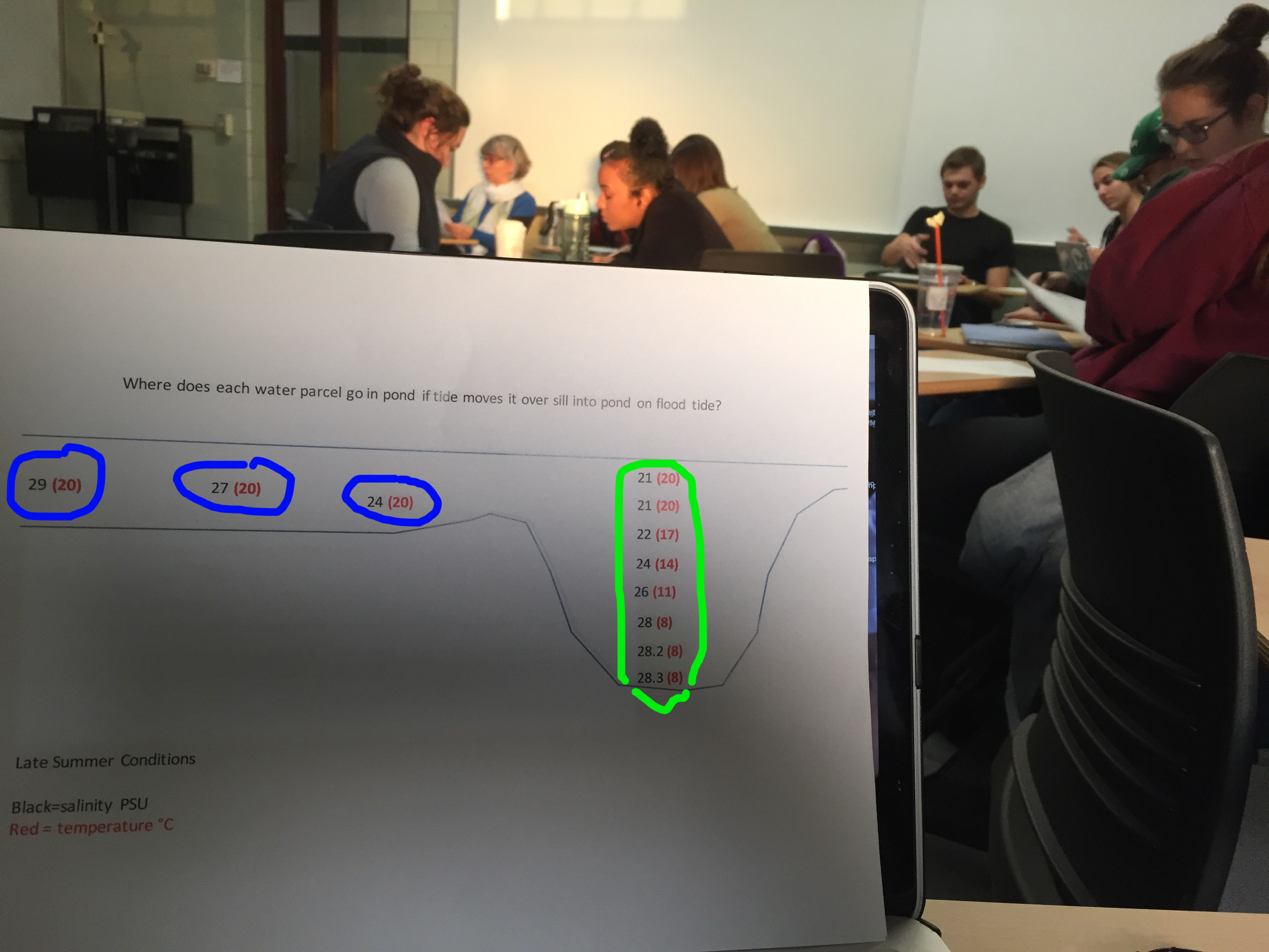 Students were given a paper starting condition of the profile (temperature and salinity) and had to determine how the tides would work in bringing in water parcels from the shallow into the deeper pond area. There were four different starting conditions loosely based on the four seasons (the winter data was made up)