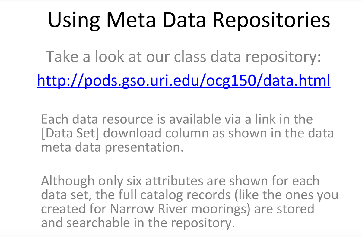 Bruce started off class with an interactive class exercise on searching for data within a meta data repository (the one the