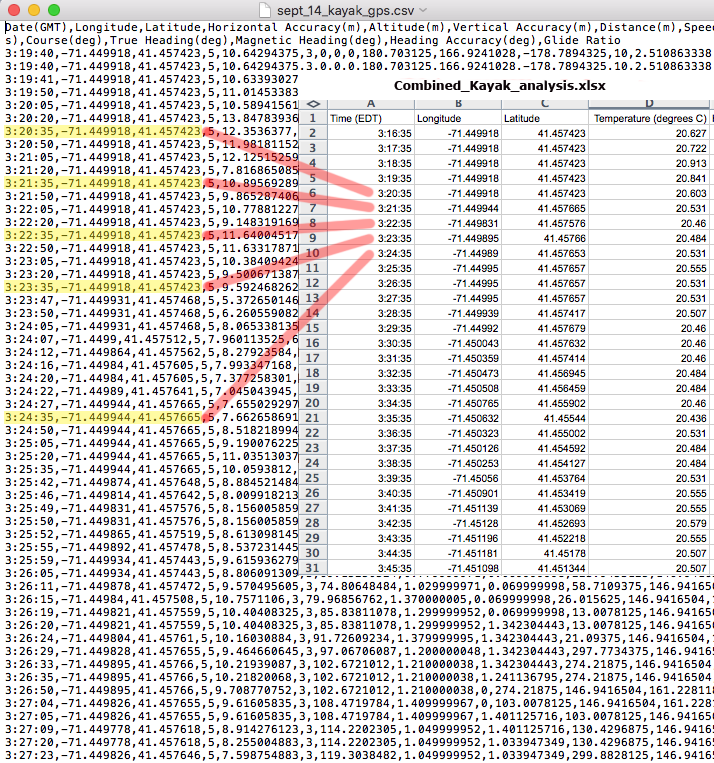 1. We e-mailed the raw GPS data to ourselves from a GPS Tracks trackline stored on Bruce's cell phone as a by-product of starting a mapping session within the software. The mailing process allowed us to choose CSV (Common Separated Value) as our export format for the attachment provided in the e-mail message. On our laptop, we downloaded the raw data file and gave the file the name: sept_14_kayak_gps.csv. Bruce opened the file in a text editor (the basic TextEdit editor that comes with a Mac operating system) and entered GPS coordinates into a Google Sheets spreadsheet for the data record provided at 35 seconds after the minute for every minute (he noticed that was the one reliable second mark throughout the file).