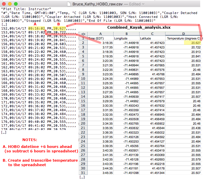 Bruce followed the steps below to create a similar analysis with his and Kathy's kayak's data for GPS and HOBO temperature (but with the times he noticed on his cell phone - 3:16pm getting in the water and 5:46pm getting out:
