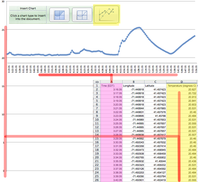 With the data set up in Google Sheets as we desired it to be, we used the Google Sheet's charting tools to create a timeseries of temperature over time. The most cumbersome task was the task of choosing the proper data ranges in the spreadsheet. After that, the chart tool did a good job of anticipating choices for formatting and axes allocation (as seen below). Since we were in eyeshot of Rob for the entire kayak trip (although typically a 100 meters or so away), our temperature track had the basic same shape as that presented in the Powerpoint presentation during class. One difference we were curious about considering was that Bruce and Kathy had used a weight to keep the HOBO submerged about five inches below the surface when standing still (it came up in the water column as we paddled with speed).