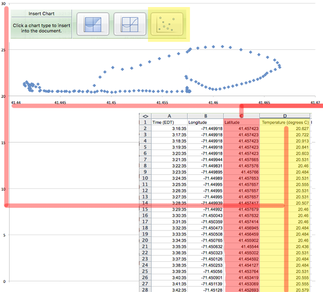 We then chose the Latitude instead of Time column data to create a scatter plot of Latitude versus Temperature. Since we were in eyeshot of Rob for the entire kayak trip (although typically a 100 meters or so away), our temperature track had the basic same shape as that presented in the Powerpoint presentation during class (except Bruce continued the analysis for the stint north to meet the other team of kayaks and back to the start). The result is seen below. We noted the same increase in temperature as we headed north, and decrease in temperature when we headed south.