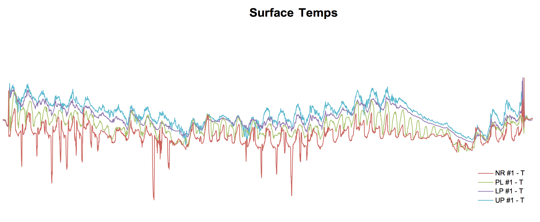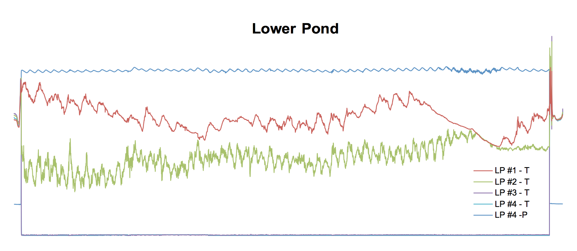 Students were able to find their HOBO sensors by serial number, extract the HOBO data, and export to CSV (comma separated values) files. They then imported the CSV files to Google Sheets. Some students thought the plots looked strange. For example: the deepest two sensors for the Lower Pond dropped off significantly and appeared to flatline down at the bottom of the plot.