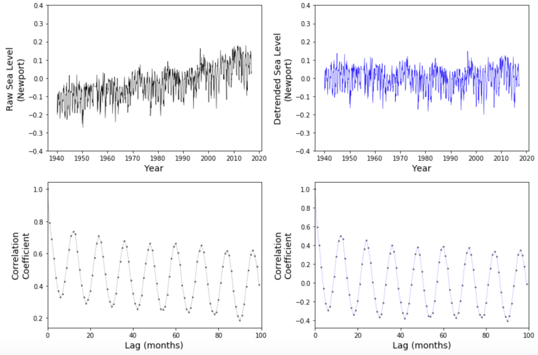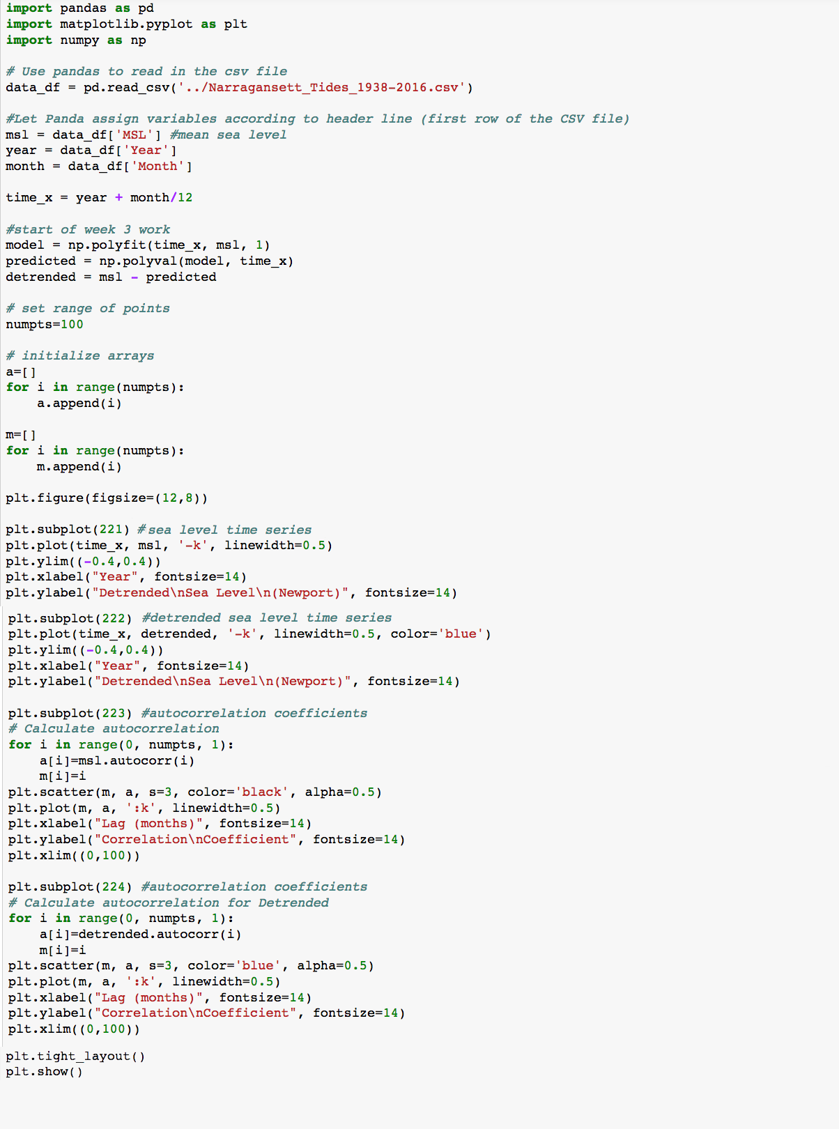 Students created an autocorrelation notebook for use with the Narragansett Bay mean sea level data. Autocorrelation can be performed on an array