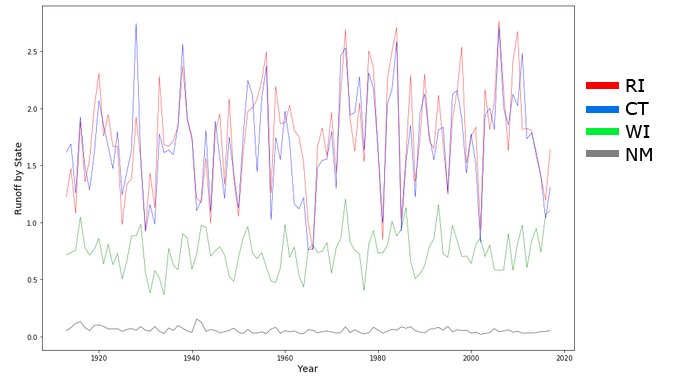 in order to perform their own time series analysis on the data. As an example below, four states were selected (RI, CT, WI, and NM) for a yearly run-off analysis (water