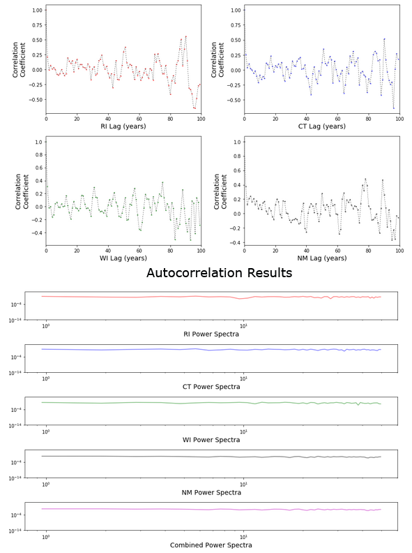 Performing both autocorrelation and power spectra analyses showed very little predictability in the data over time. The data is not detrended as no significant trend was found in all four states (and yet, both RI and CT have become concerned with the effects of groundwater run-off in recent years):
