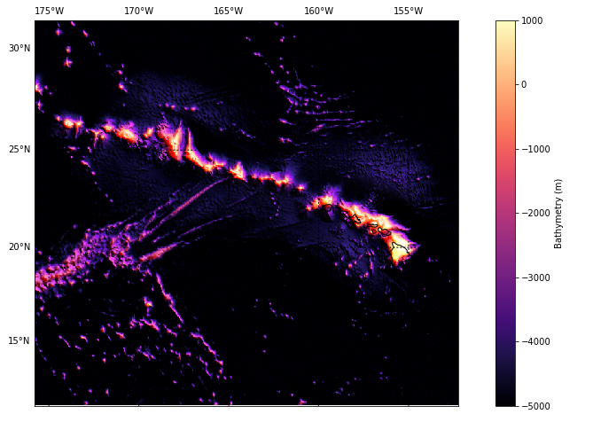 Rob provided a starter Jupyter Python notebook for NetCDF grid plotting. The download format from the GMRT Map tool is NetCDF by default. We use the latitude bounds of [11.5321, 31.3536] and longitude bounds of [-175.7813,-152.2266] as parameters to the Basemap generation process. We played with color map choices using the related Matplotlib documentation. Using the magma color map provides the plot image seen here: