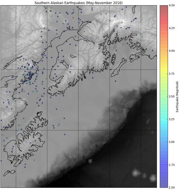Students plotted the earthquakes, coloring dots by depth magnitude, with Python as well. The earthquakes were located as seen here: