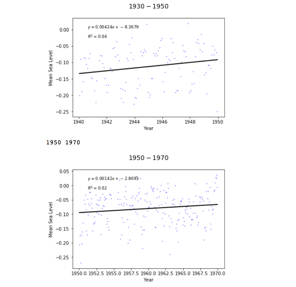 Example 1: food = 'spam' if food == 'spam': print('Ummmm, my favorite!') elif food == 'tang': print('I prefer spam over tang!') else: print("No, I won't have it. I want spam!") Example 2: x = 8 if 0 < x: # assume x is an int here if x < 10: print("x is a positive single digit.") Example 3: for letter in 'Python': # First Example print ('Current Letter :', letter) fruits = ['banana', 'apple', 'mango'] for fruit in fruits: # Second Example print ('Current fruit :', fruit) print ("Good bye!") Example 4: for num in range(10,20): #to iterate between 10 to 20 for i in range(2,num): #to iterate on the factors of the number if num%i == 0: #to determine the first factor j=num/i #to calculate the second factor print ('%d equals %d * %d' % (num,i,j)) break #to move to the next number, the #first FOR else: # else part of the loop print (num, 'is a prime number')Rob then ran a class exercise that revisited the Newport sea level data to deconstruct the rate of change into twenty-year time periods. Examples of two of the periods are shown below.