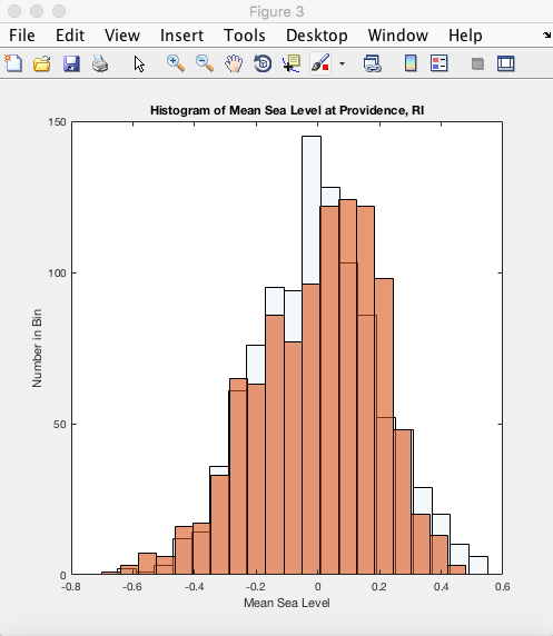 In figure 3, the white background histogram has been generated by a random fit of 1021 values using the mean and standard deviation to create them. The binning is different from the binning of the actual detrended msl data, which is shown in the faded red.
