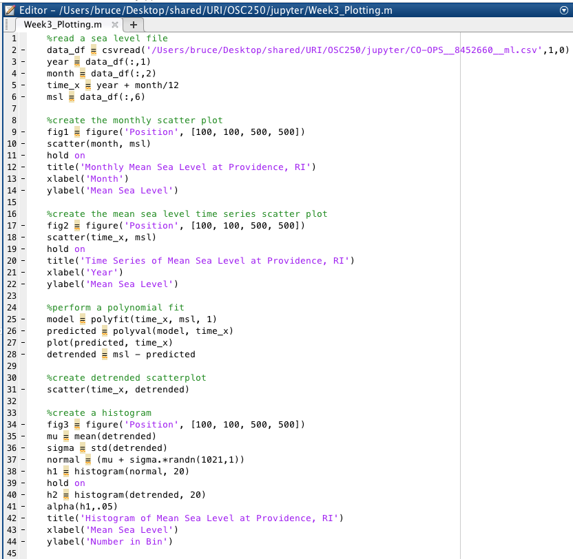 MATLAB is another popular script-driven computing environment for doing ocean science data analysis. Below is an example of doing MATLAB work, using the classroom activity on February 8th as an example. Compare the MATLAB script with the Python script we wrote to do a similar analysis. The MATLAB script is here: