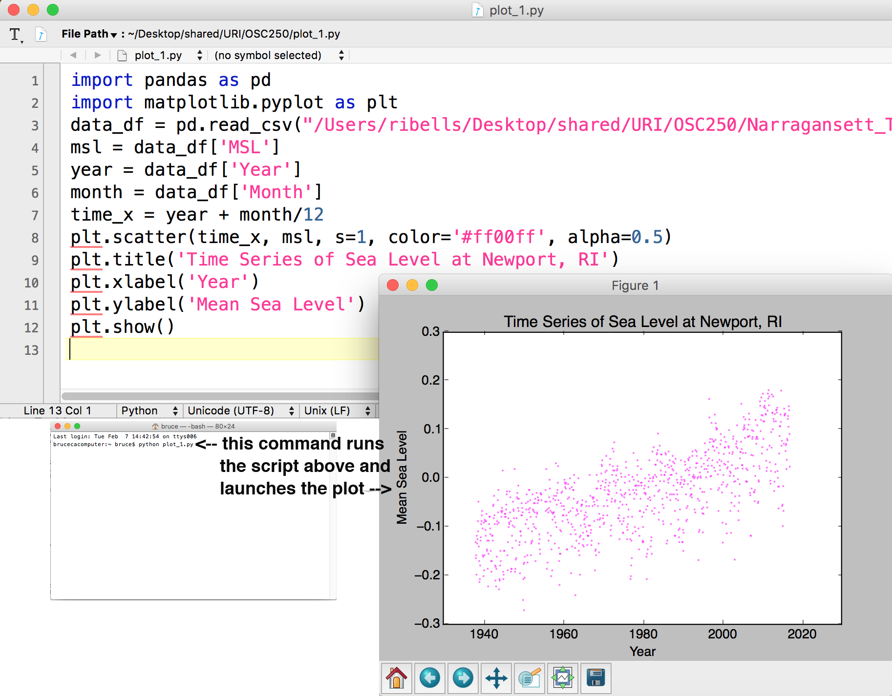The Python interpreter can run those commands and provide me the same plot as when typing them into the interpreter one line at a time. On a very busy analysis (of water quality and quantity predictions for climate scenarios for a watershed river basin), I typically have tens or even hundreds of Python script files saved with a .py extension and a coordinated file naming scheme that helps me remember when each script is useful for analysis needs.