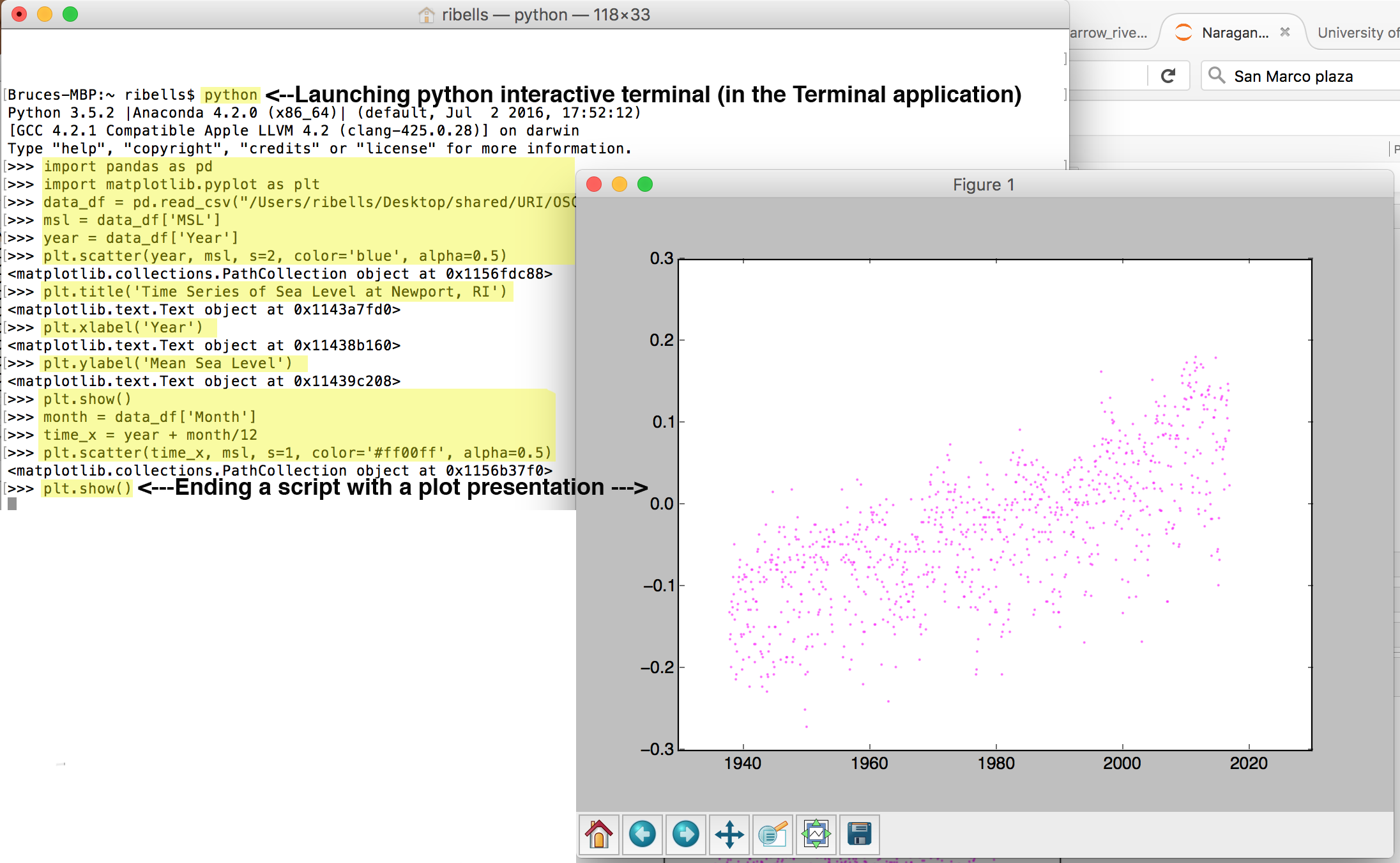 Operating systems provide applications for interacting with the control of a computer through typed commands. On the Mac OS (and most flavors of Linux), there is an application called Terminal (as seen below). Within the Windows OS, there is an application called Command (or cmd or Command Prompt). Launching these programs provides access to running the python command. The python command provides an intearctive python terminal in which code statements written in Python can be run one at a time. Below shows a terminal session whereby I typed in everything that has been highlighted in yellow (the white text are feedback output provided by the Python language). When I finish by typing the plot.show() command, a plot window appears with the identical plot I saw embeddded in the Jupyter notebook in class.