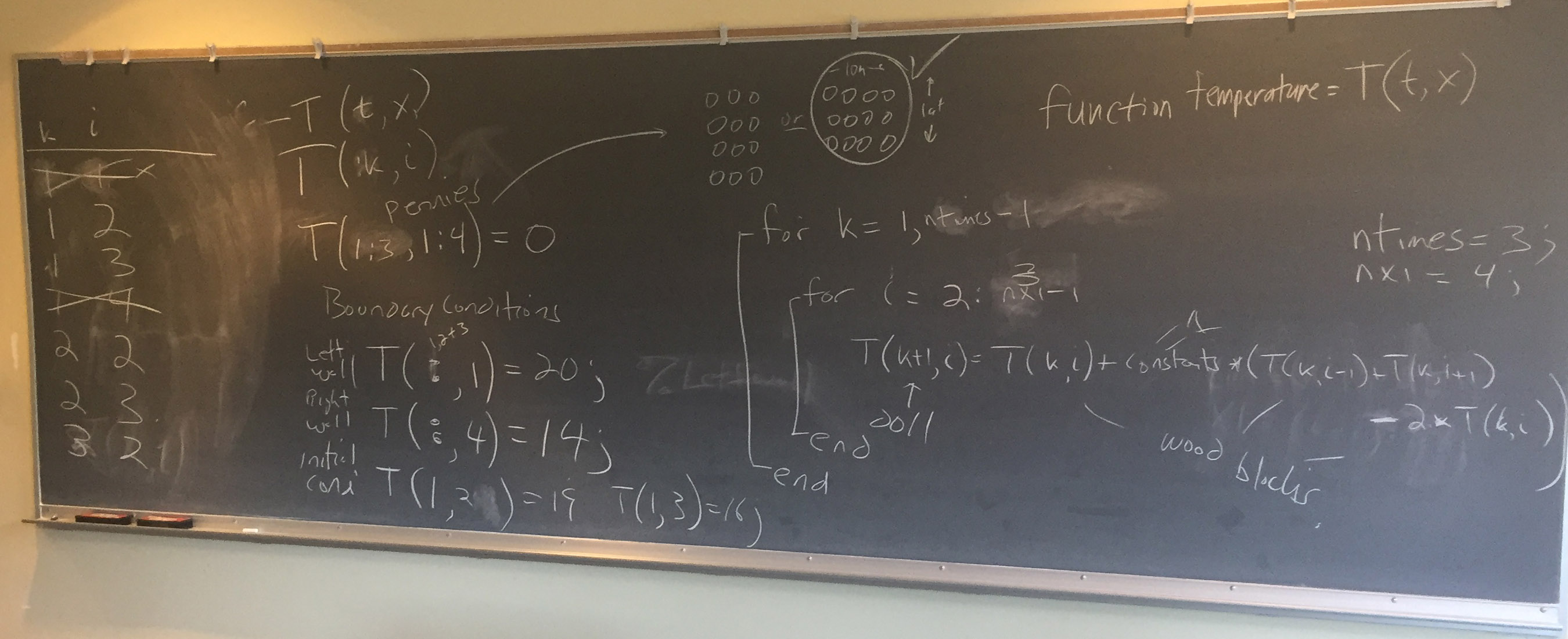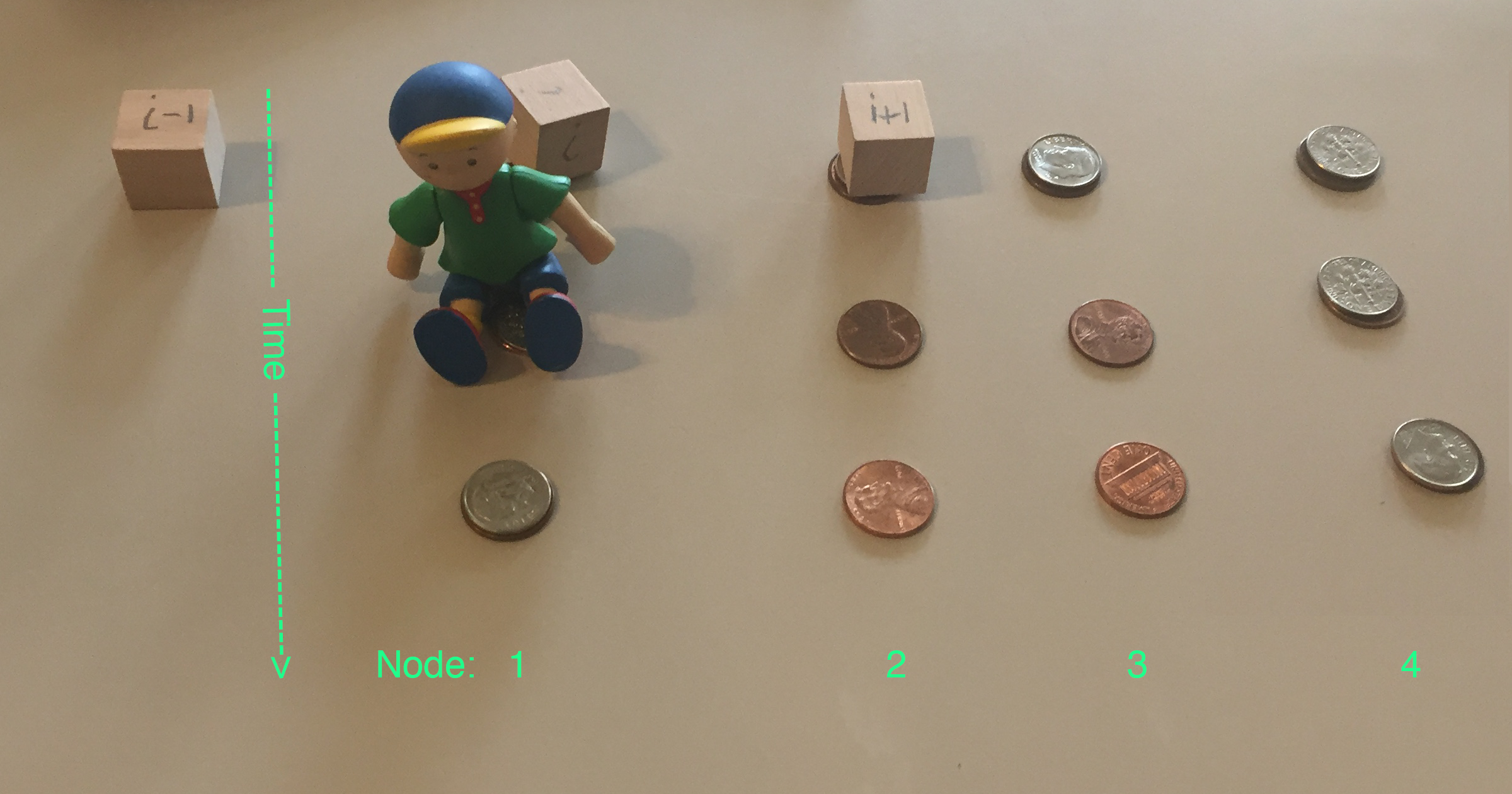 Dimes represented locations in memory that has been set with meaningful values, while pennies represented locations in memory that had been set to zero as an initialization value. Blocks represented the terms in memory currently being used in a timestep computation. The character represented the current timestep being considered. The blocks and character moved forward in space as students worked through code concepts on the blackboard: