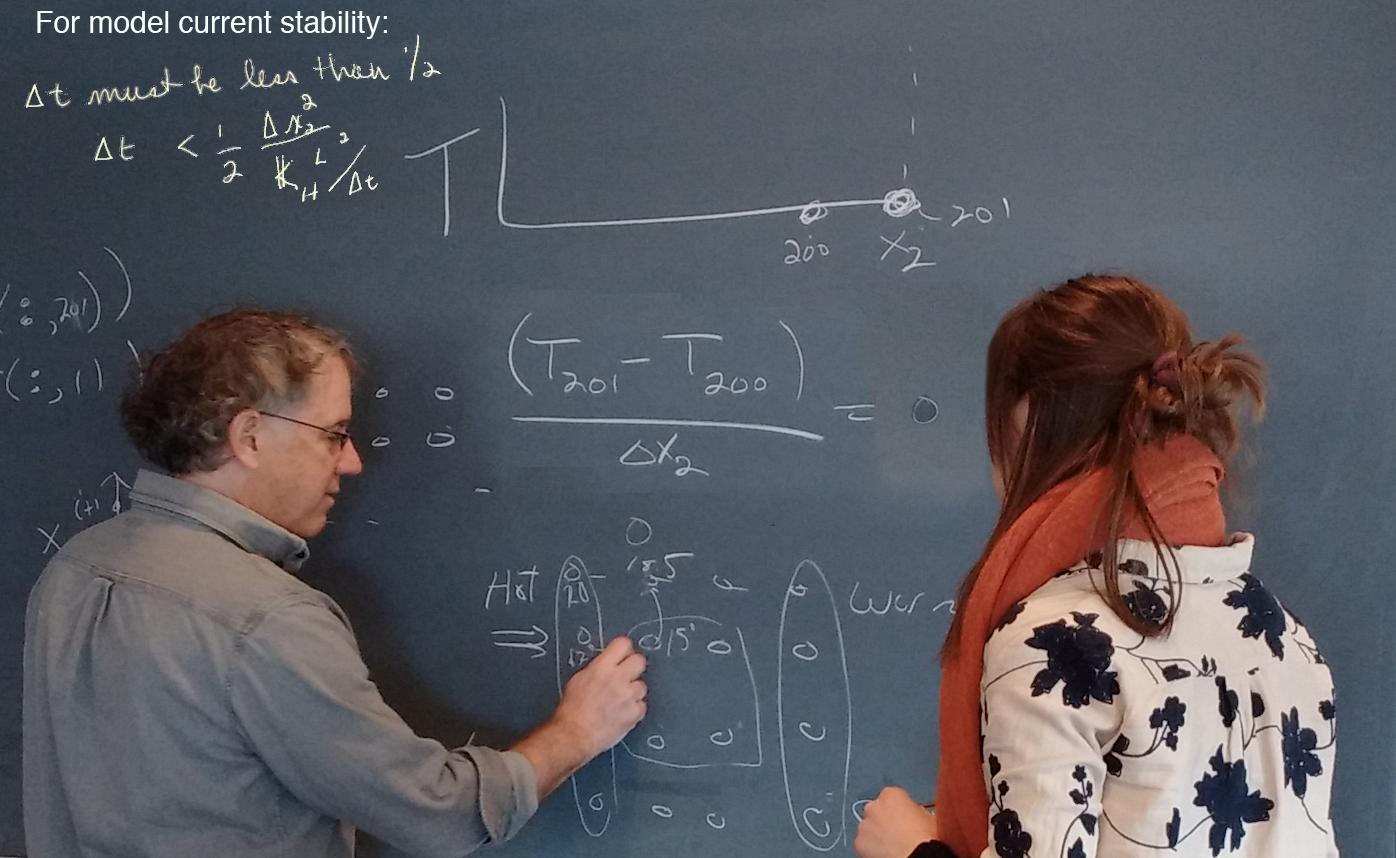 Chris explained how advection works via a diagram of water parcel nodes, explaining how the change in temperature has to be small enough to keep the computations stable. Since the magnitude of eddy in the vertical direction is much smaller than the lower, the criteria to satisfy references x2 (or x1) and the horizontal kappa: