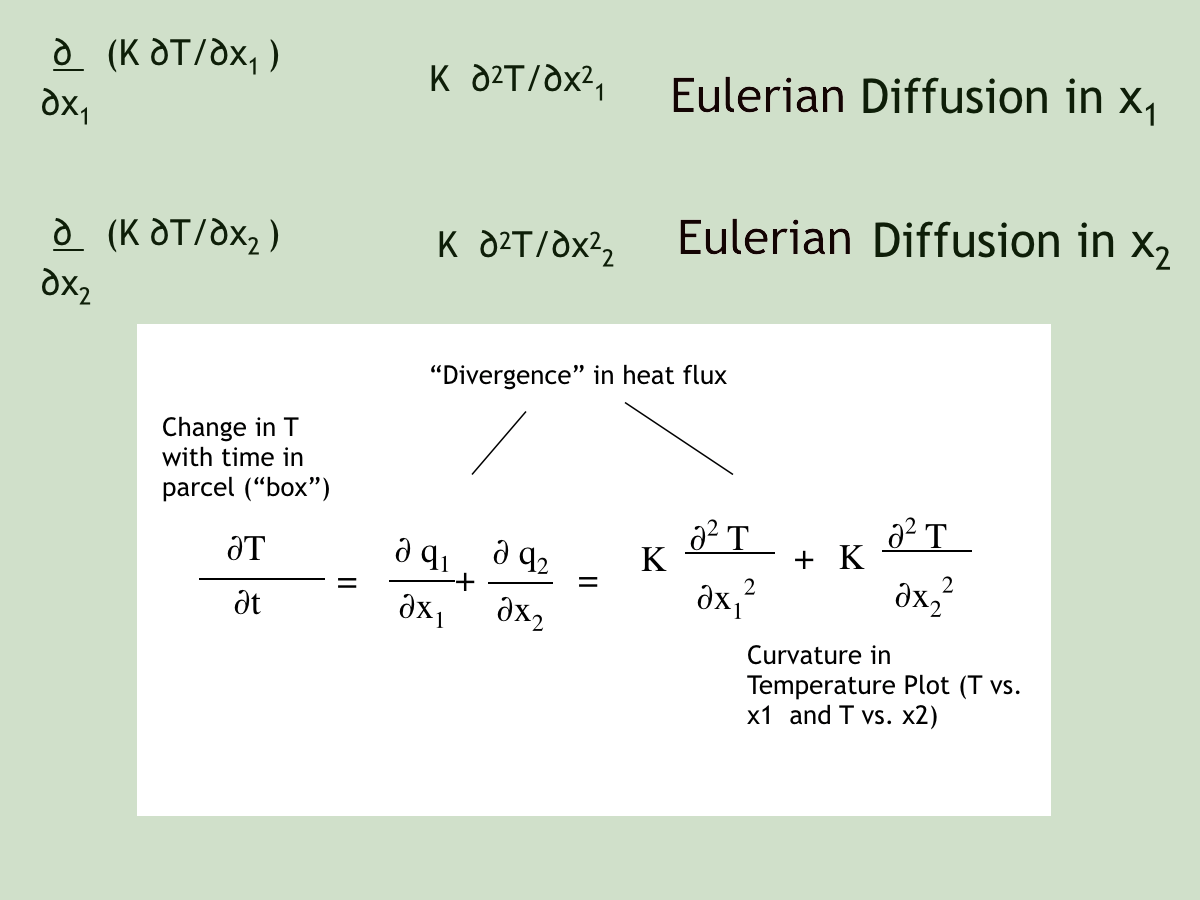 Chris pointed out that the homework assignments would break two-dimensional eddy computation into two pieces. Homework #5 would apply diffusion to a cross-section of a water body (using x2 as L and x3 as depth), while homework #6 would add advection as seen in class today.