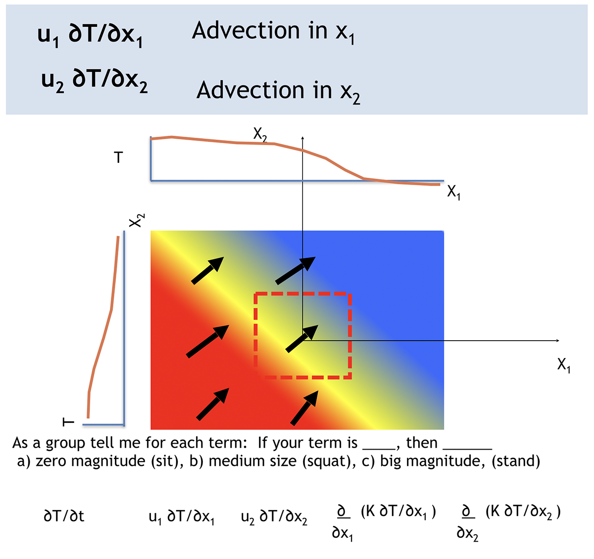 Chris reviewed the Eulerian advection component and its added complexity to a 2-D magnitude of terms exercise: