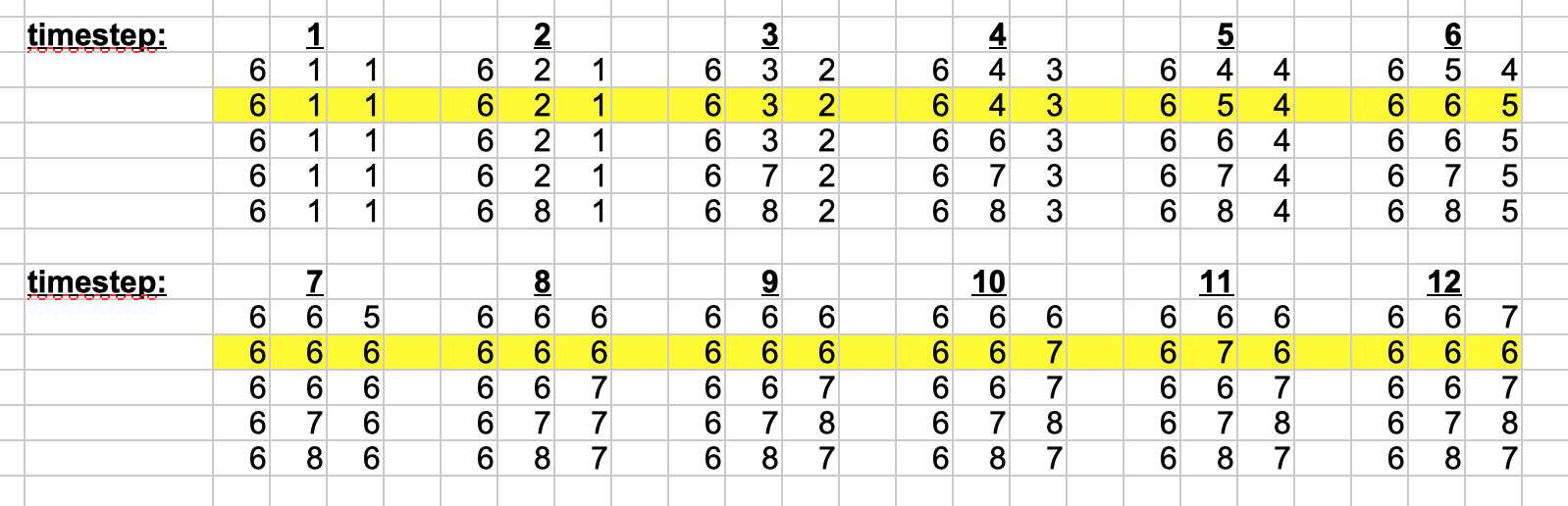 time W C R 1 6 1 1 2 6 2 1 3 6 3 2 4 6 4 3 5 6 5 4 6 6 6 5 7 6 6 6 8 6 6 6 9 6 6 6 10 6 6 7 11 6 7 6 12 6 6 6