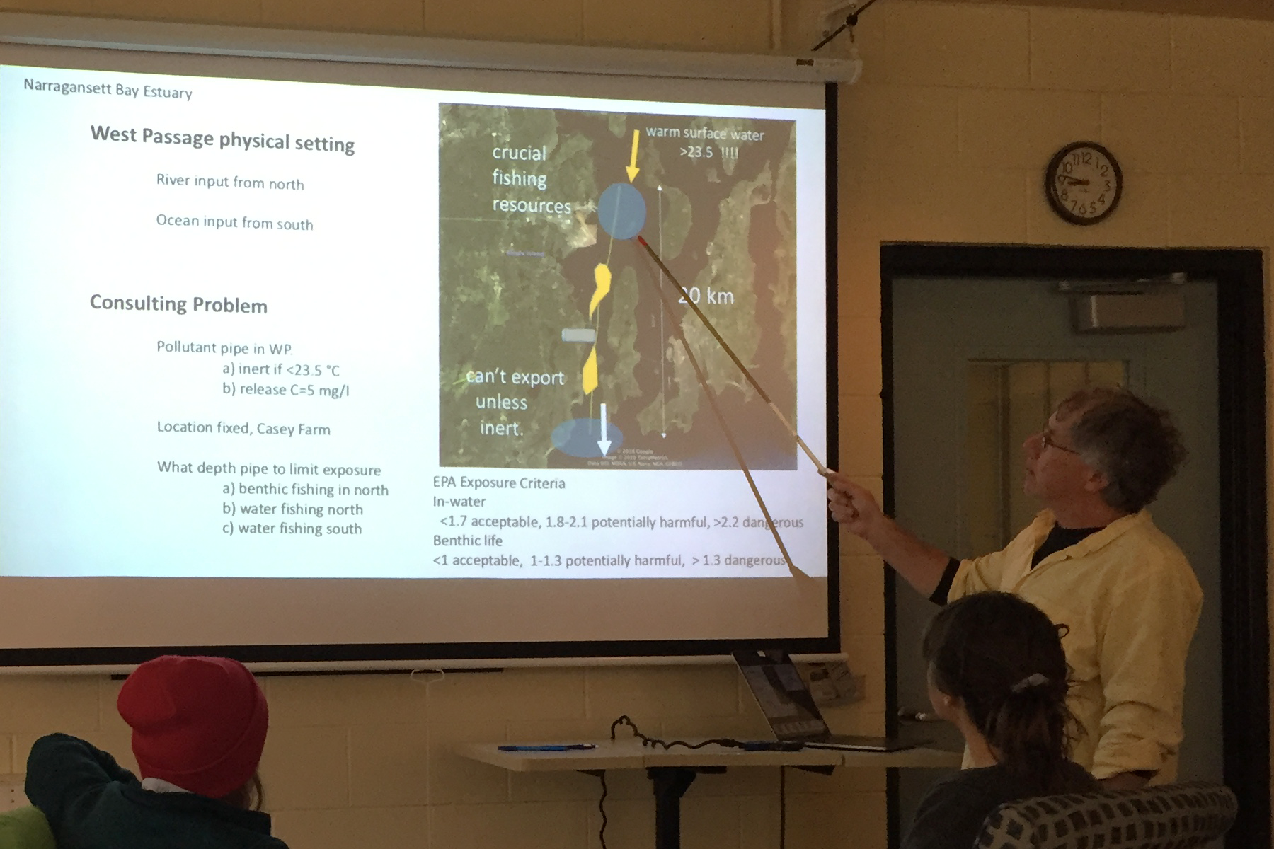 A factory to appear where Casey Farm currently exists, just north of the URI Bay Campus. The factory wants to release their waste chemical for a month in summer each year. Chemical stays inert under 23.5 degrees C (so we want to release only then — it sticks around for a month. We wan to keep it out of mixing with the colder bottom waters. The overall situation looks like this: