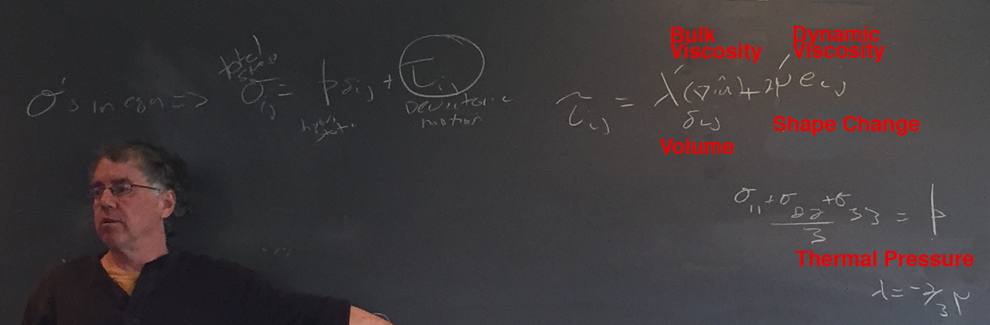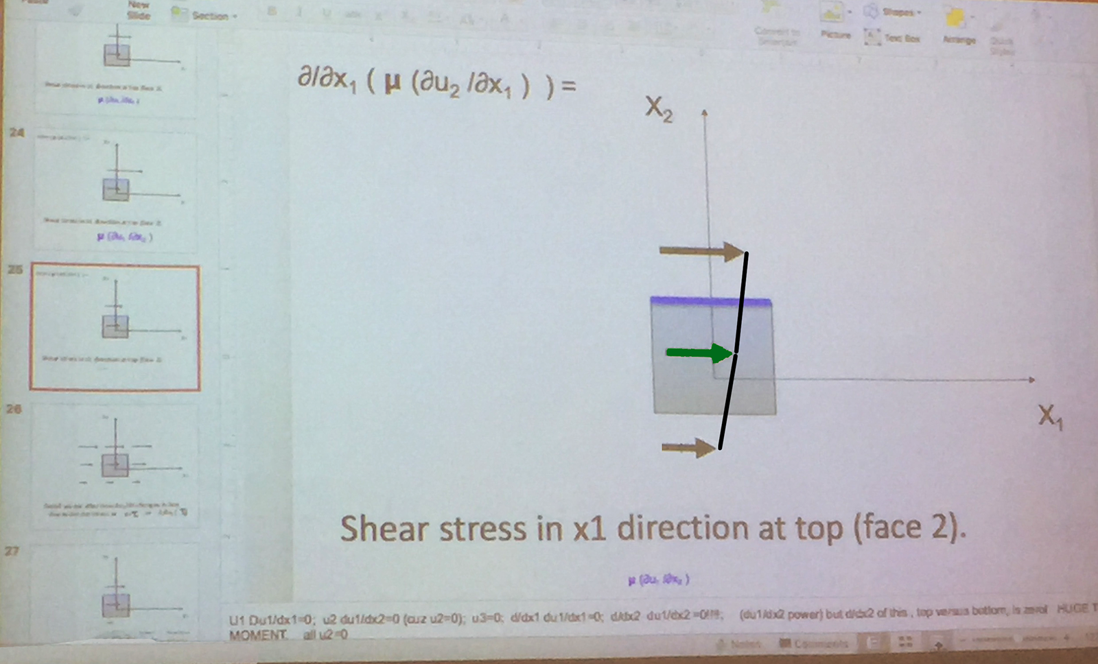 Chris then ran through a series of stress situations to consider u * (du1/dx2) as viscosity (u) and sheer (du1/dx2) effects and the combination of both to consider how much actual sheer takes place). If viscosity is low, the stress is minimal. When viscosity is high, the overall stress increases: