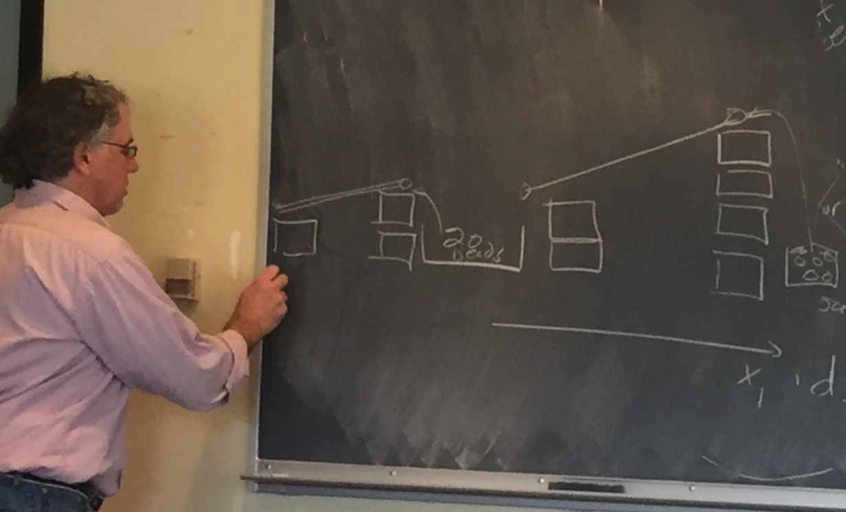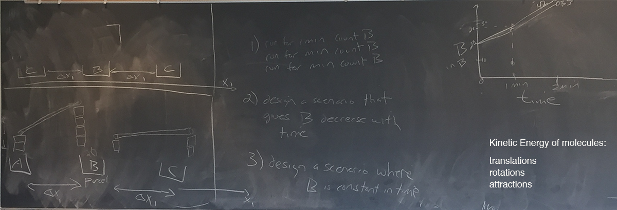 Chris asked student teams to provide configurations (seen on the blackboard above) that decreased the ball count in the middle bin and then as a class to create a bin with pipes connecting in four directions (to consider a 2-D heat transfer simulation).