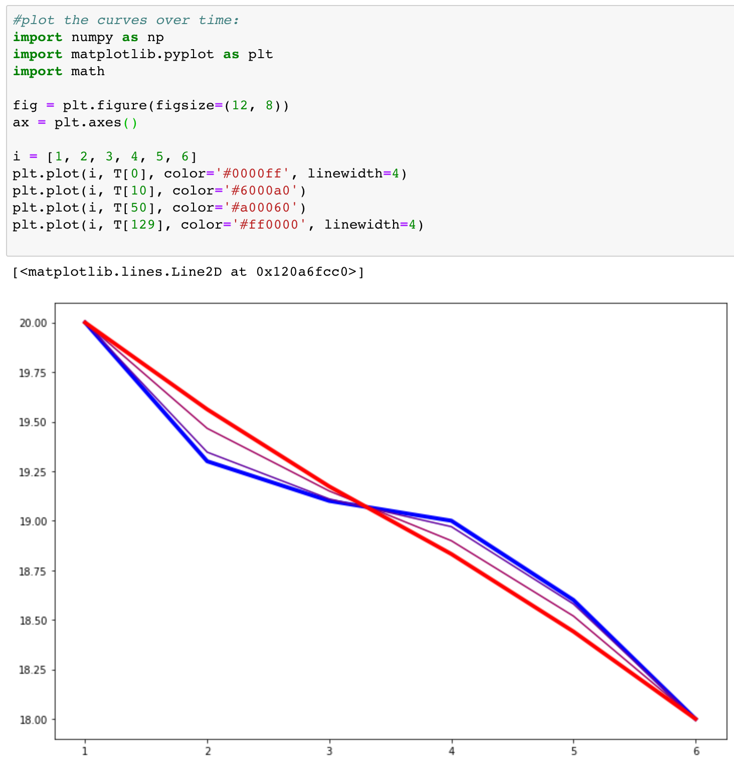The code sets up a new figure, defines the axes (which can then be labeled later), creates an array of node identifiers, and then plots starting conditions (blue), timestep 10 (purple), timestep 50 (violet), and timestep 129 (red) to show how the heat converges on a straight line between nodes.
