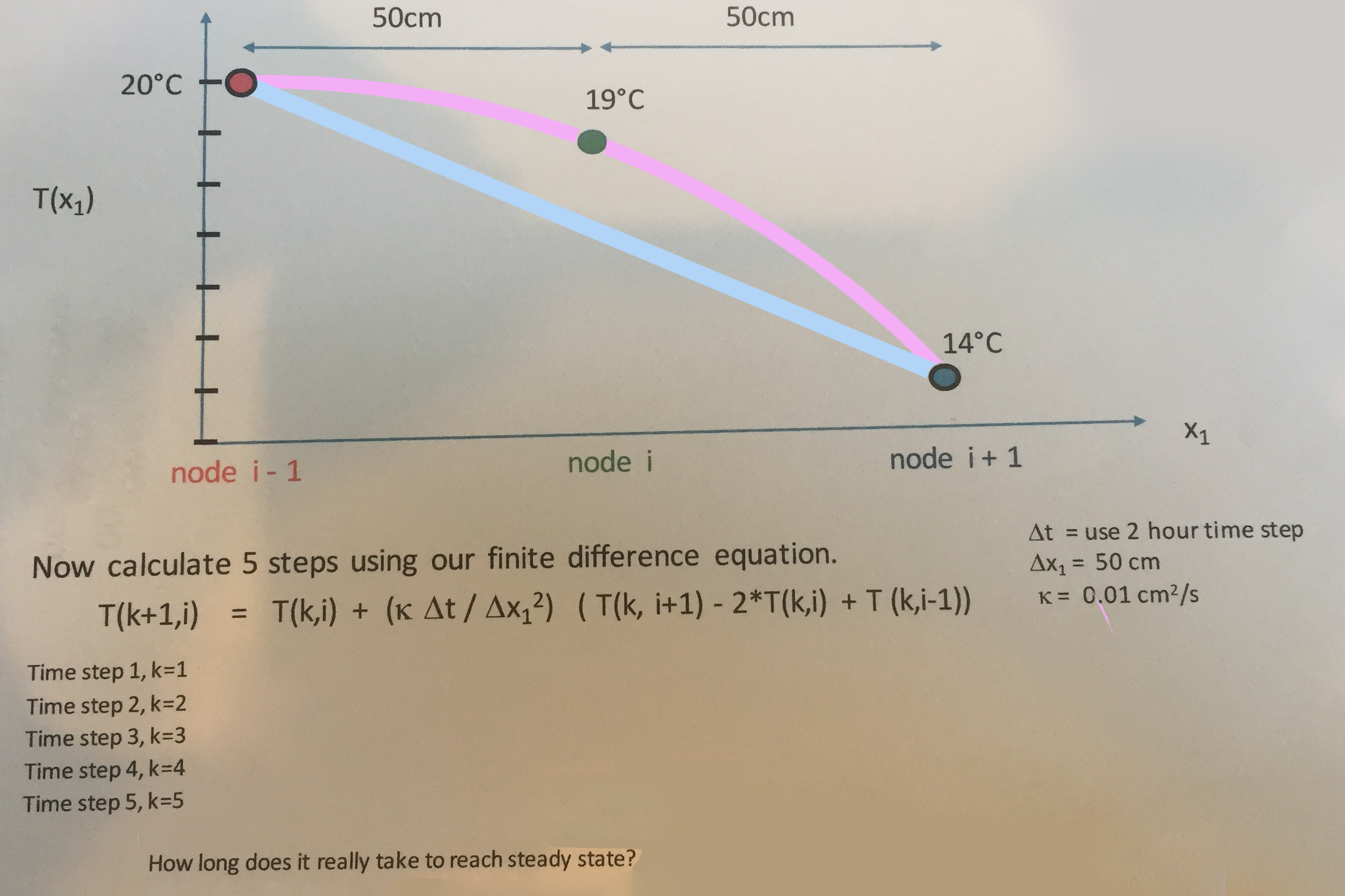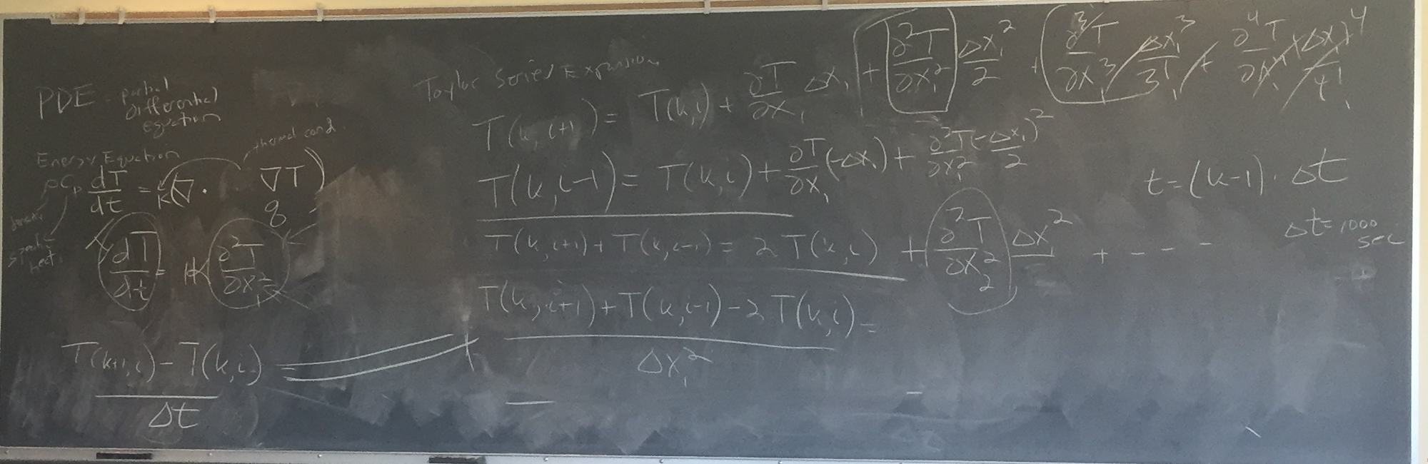 Then he solved for the T(k+1, i) — where k is the node (distance in x1) and i is the timestep (see the blackboard above).