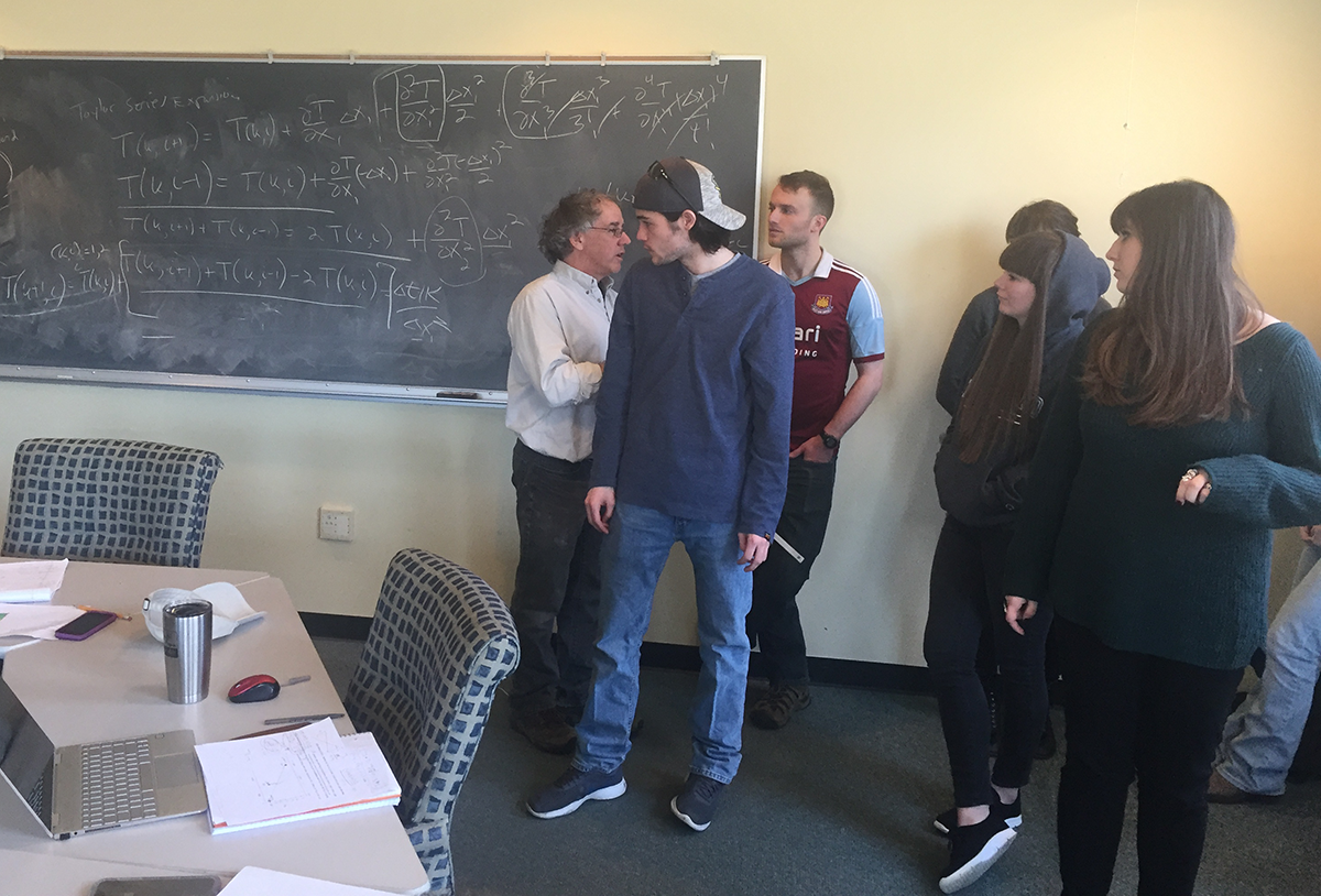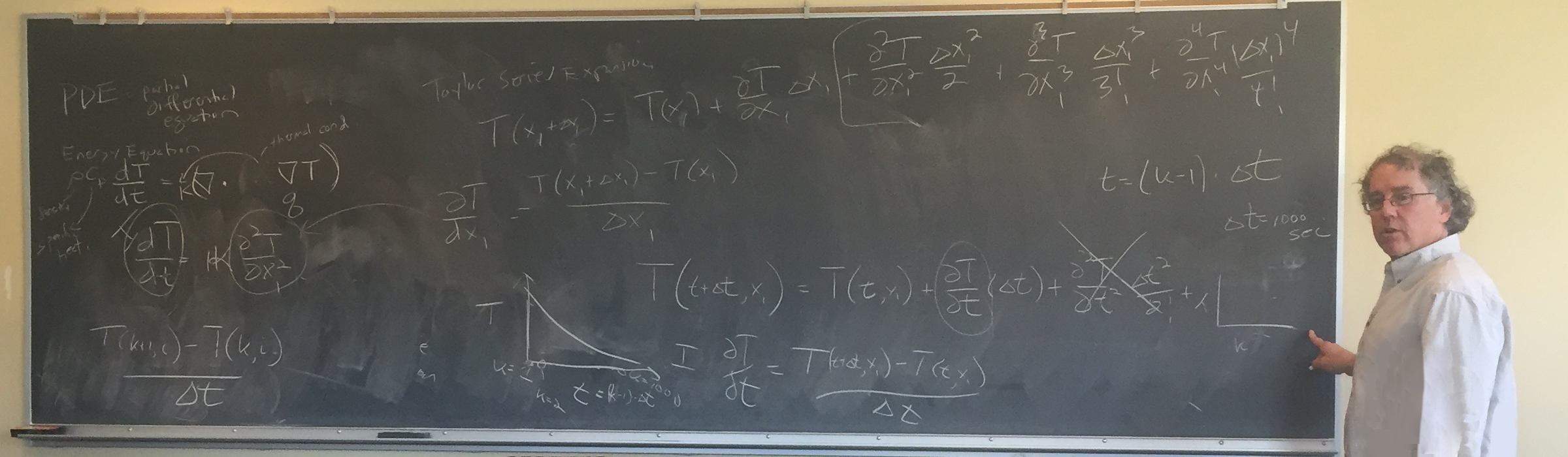 He reminded students that the rate of change in Temperature decreases over time (the curve in the middle of the blackboard above)