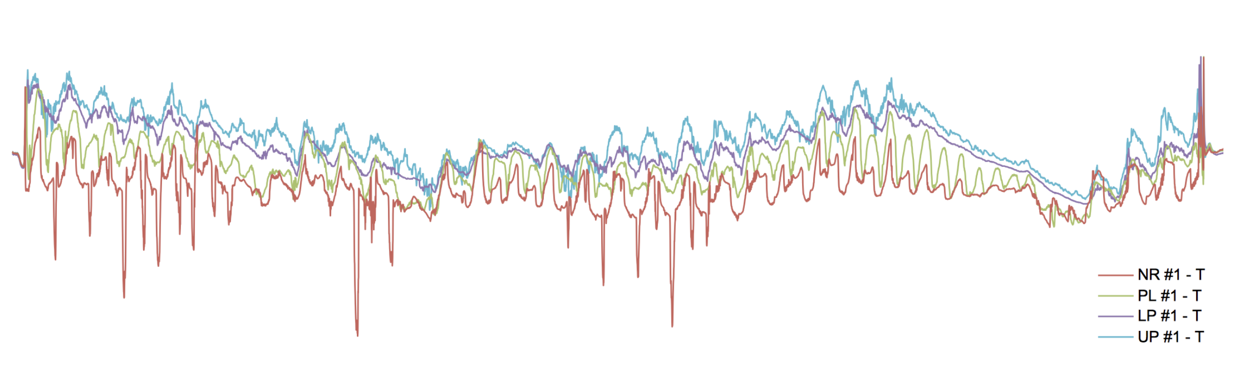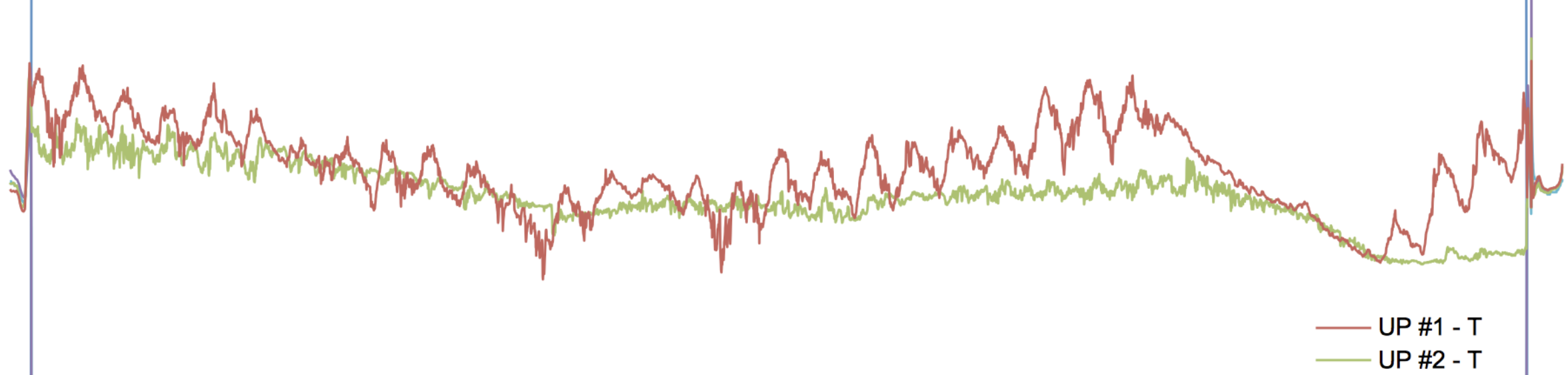 The resulting data are available as a Comma Separated Values (CSV) file. A chart of the data is shown to the right for the two sensors that continuously recorded reasonable data.