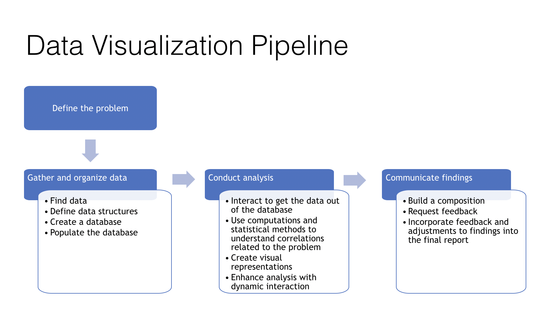 We started off with an interactive lecture reviewing what we have done together so far in pursuit of gaining insight into a visualization pipeline process:Bruce reminded the students that our #1 goal for the course is to get some familiarity with the data visualization pipeline: