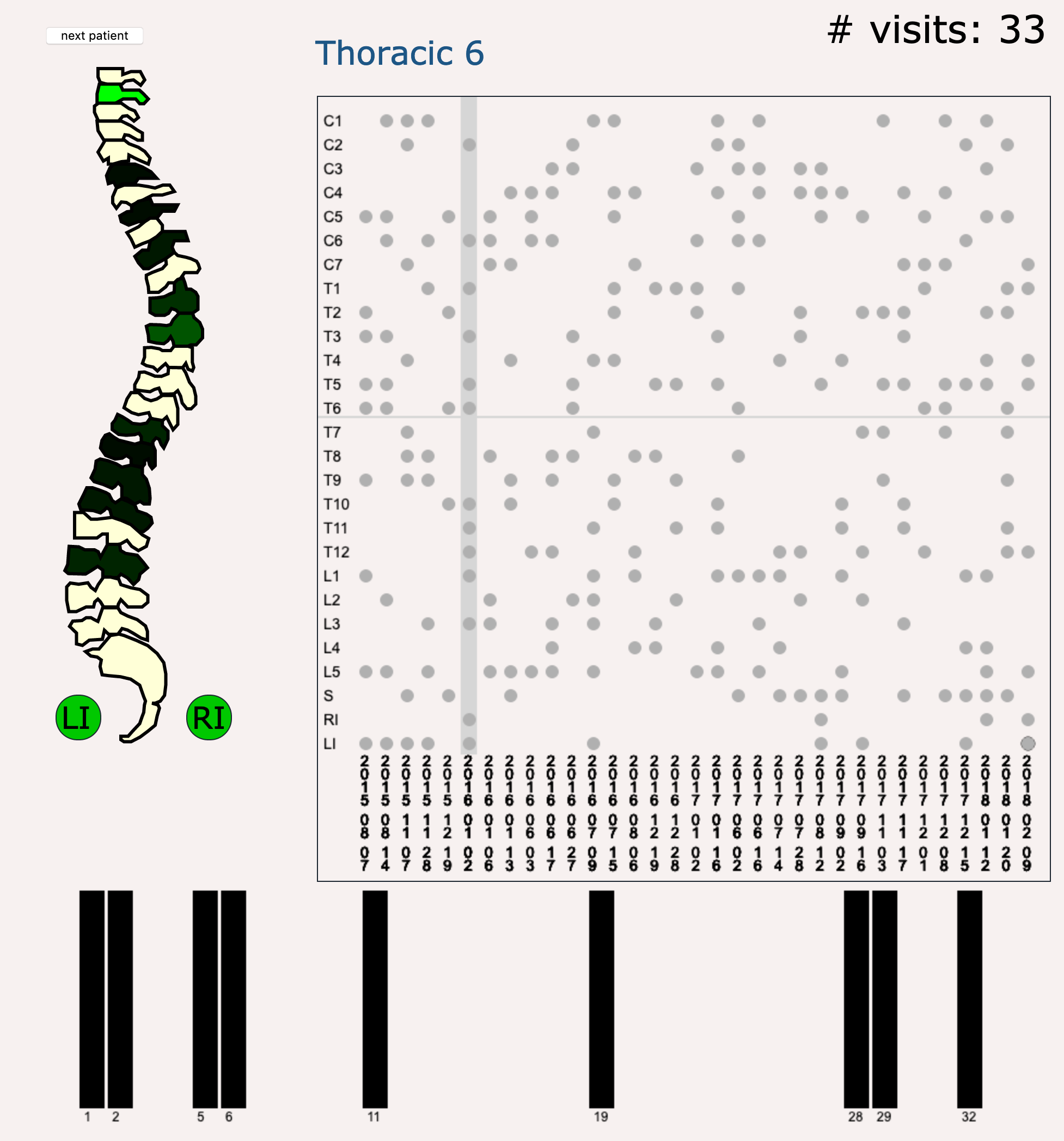 To the right is a dot plot that had been recommended by another student when project ideas has been informally discussed earlier in the course. The dot plot shows all the dates of chiropractor visit events across the bottom and all vertebrae down the left. Users can click on any vertebra adjustment (represented by grey dot) and update the bar chart and spine visualization.