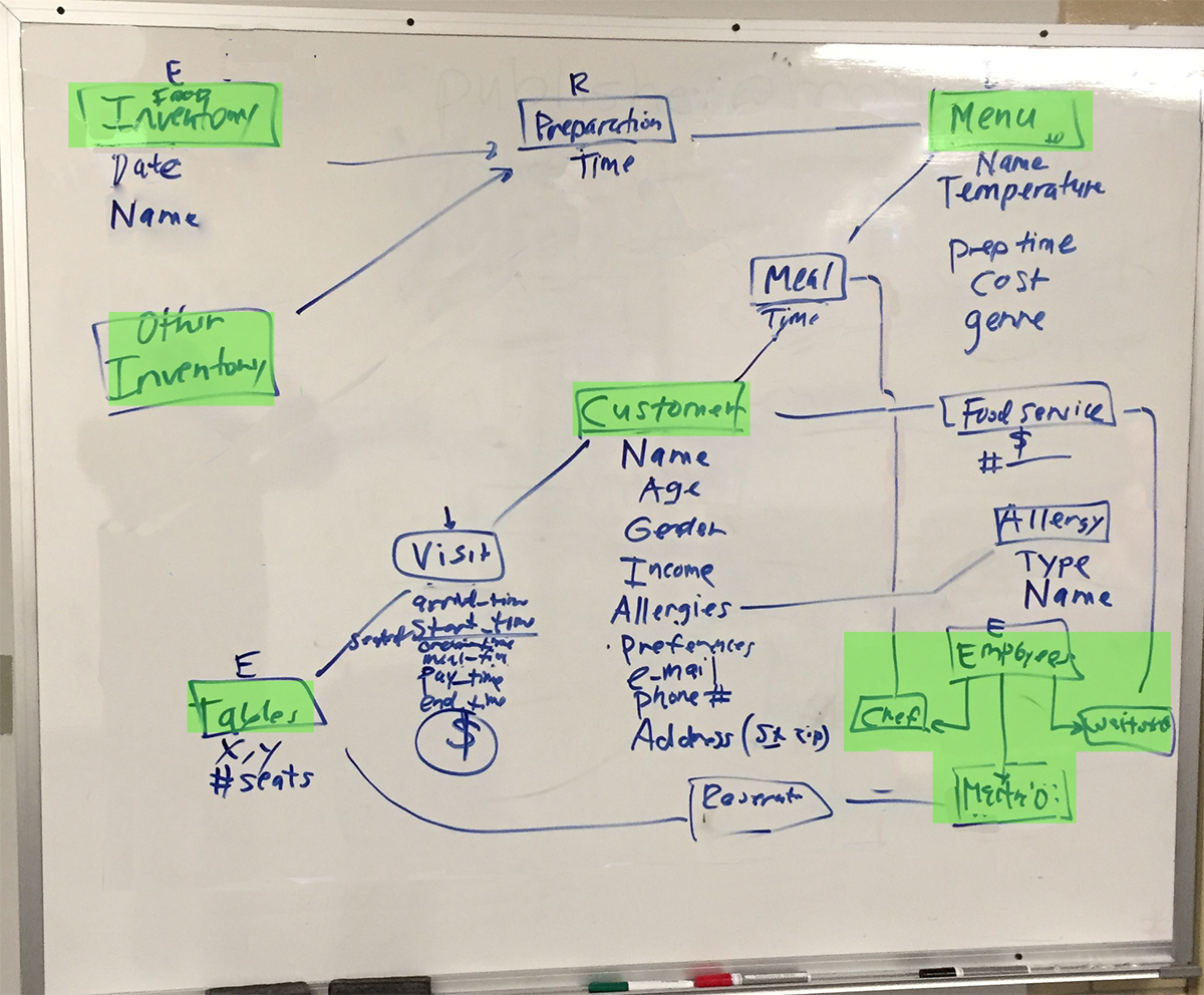 Bruce led a simple example of creating a data model for a restaurant (e.g. employee data, customer data, menu data, and a meal relationship between the three). The result was captured on a whiteboard: