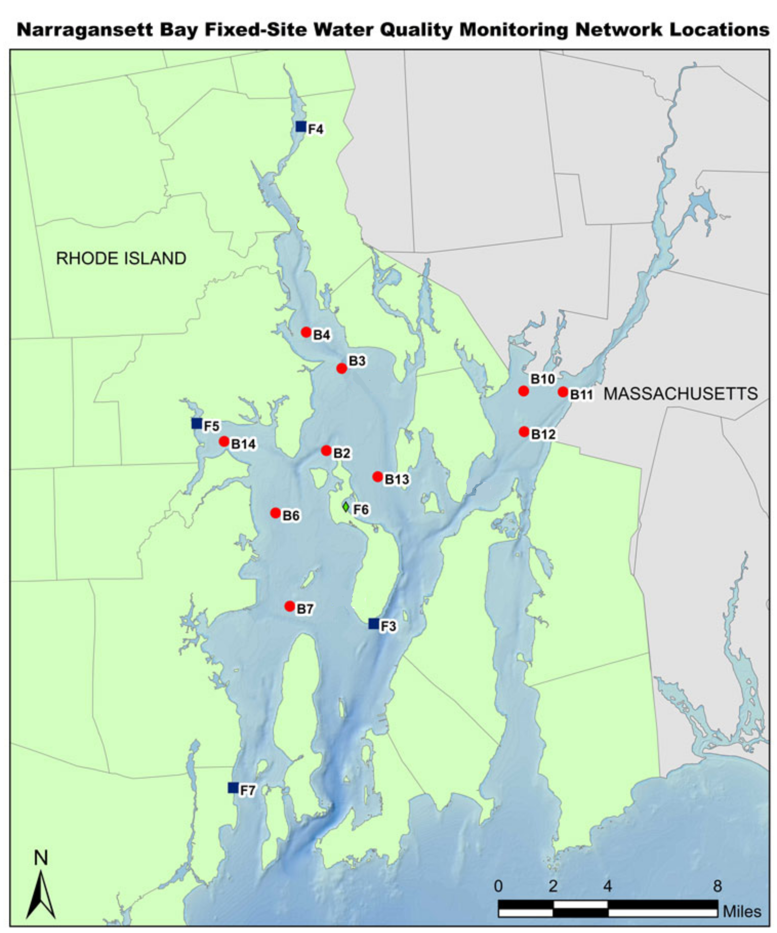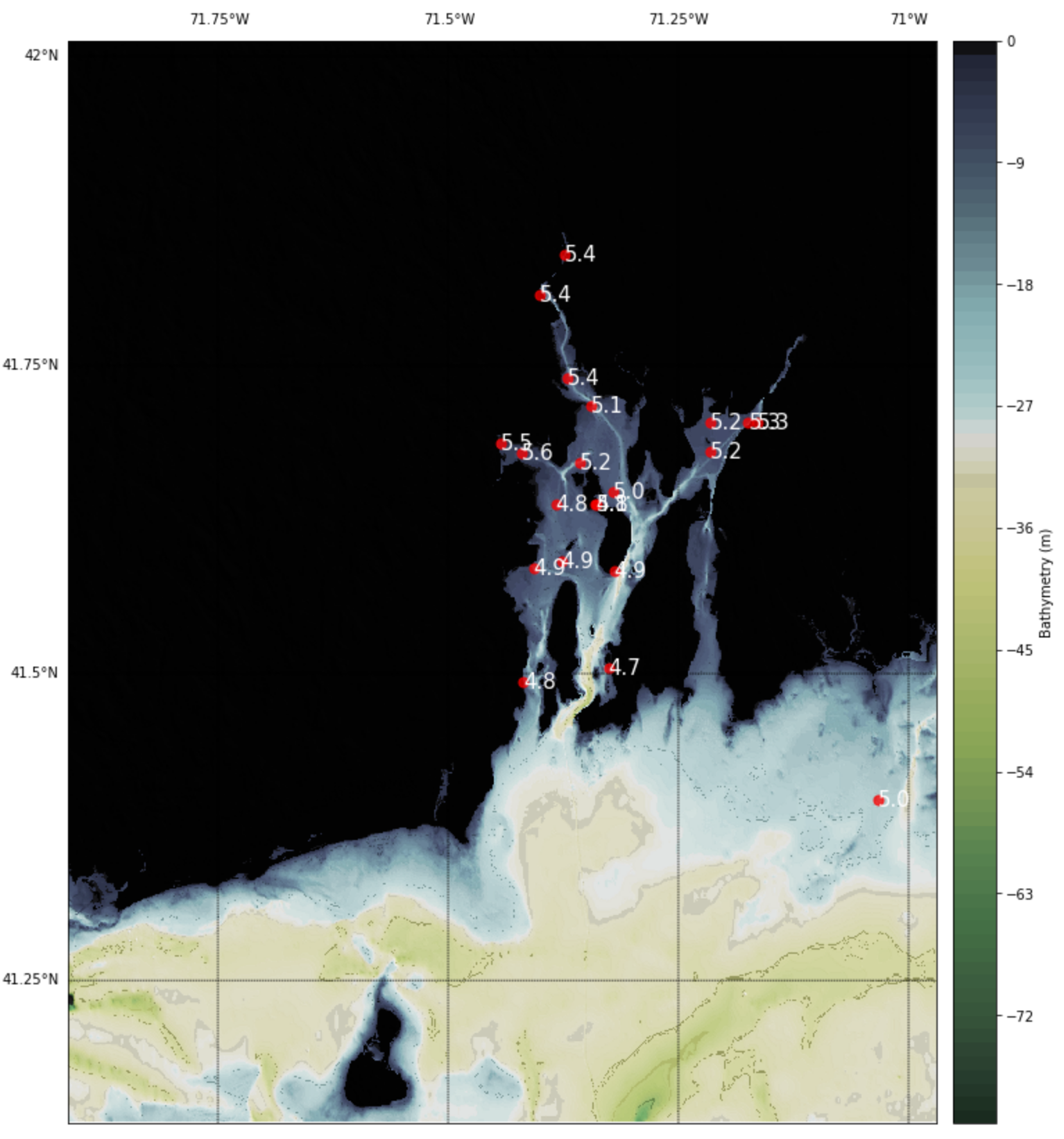 conda install netcdf4 conda install basemap-data-hiresThe buoy information comes from two sources (merged together in the buoys.csv file). First, we use data from the Narragansett Bay Fixed-Site Water Quality Monitoring Network: