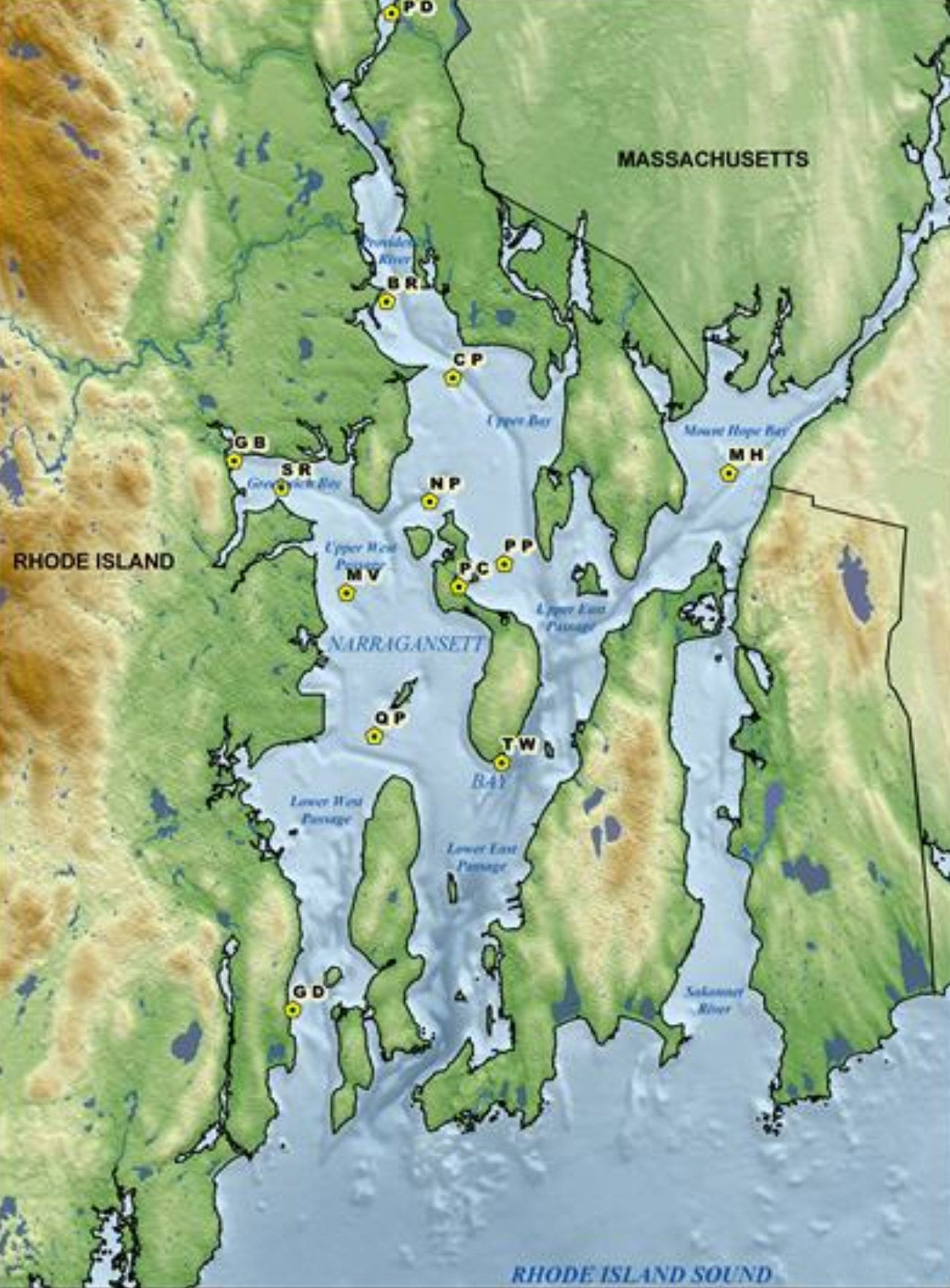 based on the altitude of each location in Narragansett Bay. The HTML code can be saved in a basemap.html file: