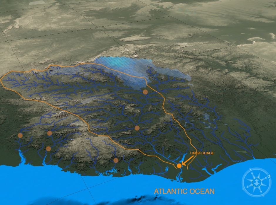 The watershed is a major river system within Espirito Santo (other rivers in the state are shown outside of the orange boundary line). The watershed drains into the Atlantic Ocean in southern Brazil (just north of the coastal state of Rio de Janeiro), affecting the ocean modeling work done off the coast. The World Bank funded research to ascertain whether development could be moved from Rio (a highly-developed state) to Espirito Santo (an untouched state in comparison) as the Espirito Santo government was concerned about the quality and quantity of water available to its residents.