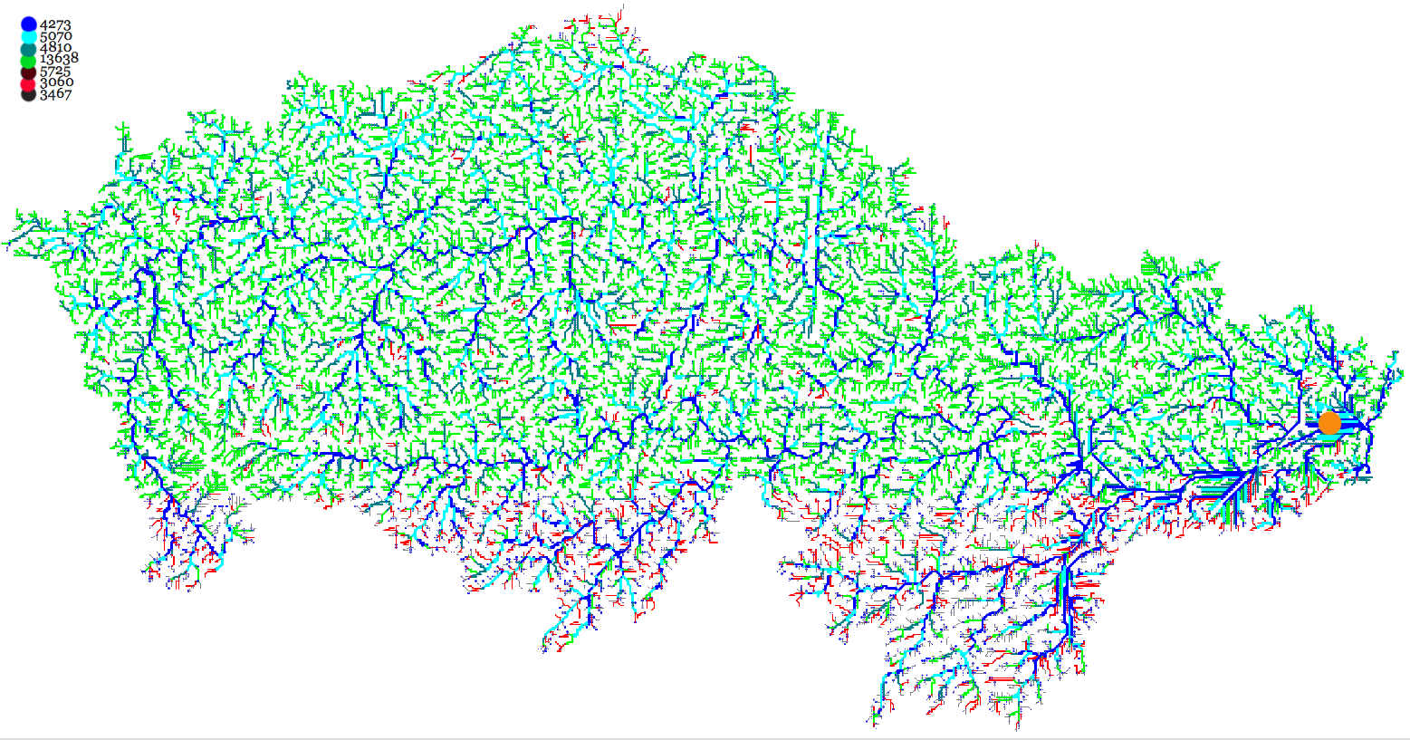 The streams were clustered by the amount of average flow in the channel (a count by network segment type, largest to smallest, appears in the upper-left corner).
