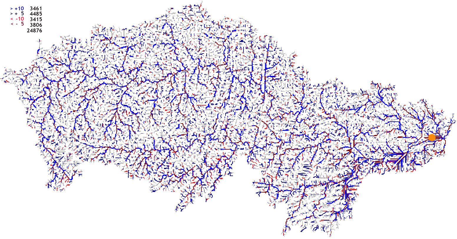 The legend in the upper left counts stream network segment changes (a segment is a stream channel between branches at both ends) and colors them by 10% or more increase, 5-10% increase, 10% or more decrease, 5-10% decrease and between -5 and 5% change.