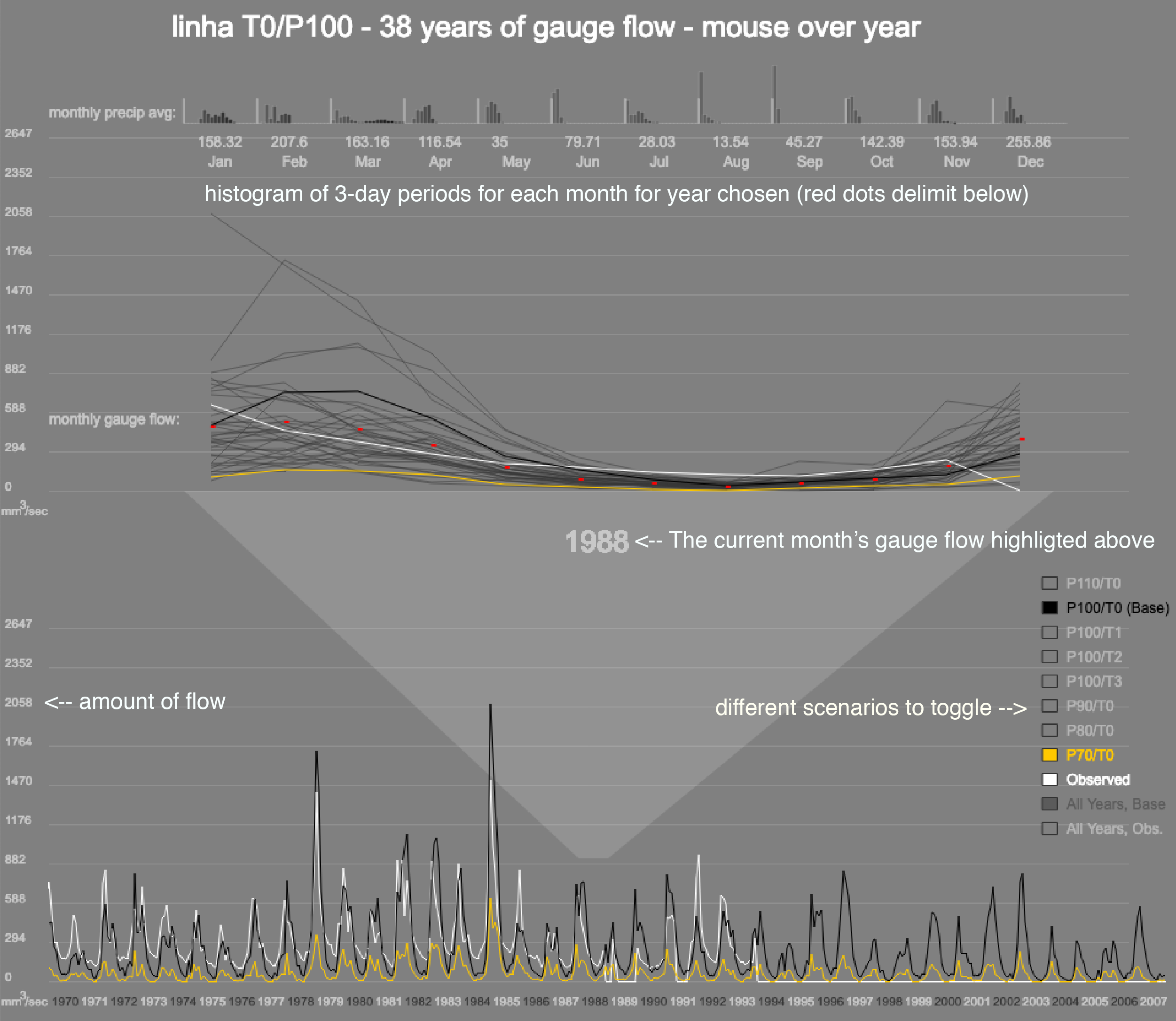Students can use the legend in the lower-right to add or remove the scenarios from the visual analytics application. In the screenshot here, The P100/T0 scenario (no change to precipitation or temperature), Observed, and P70/T0 scenarios are active in the display: